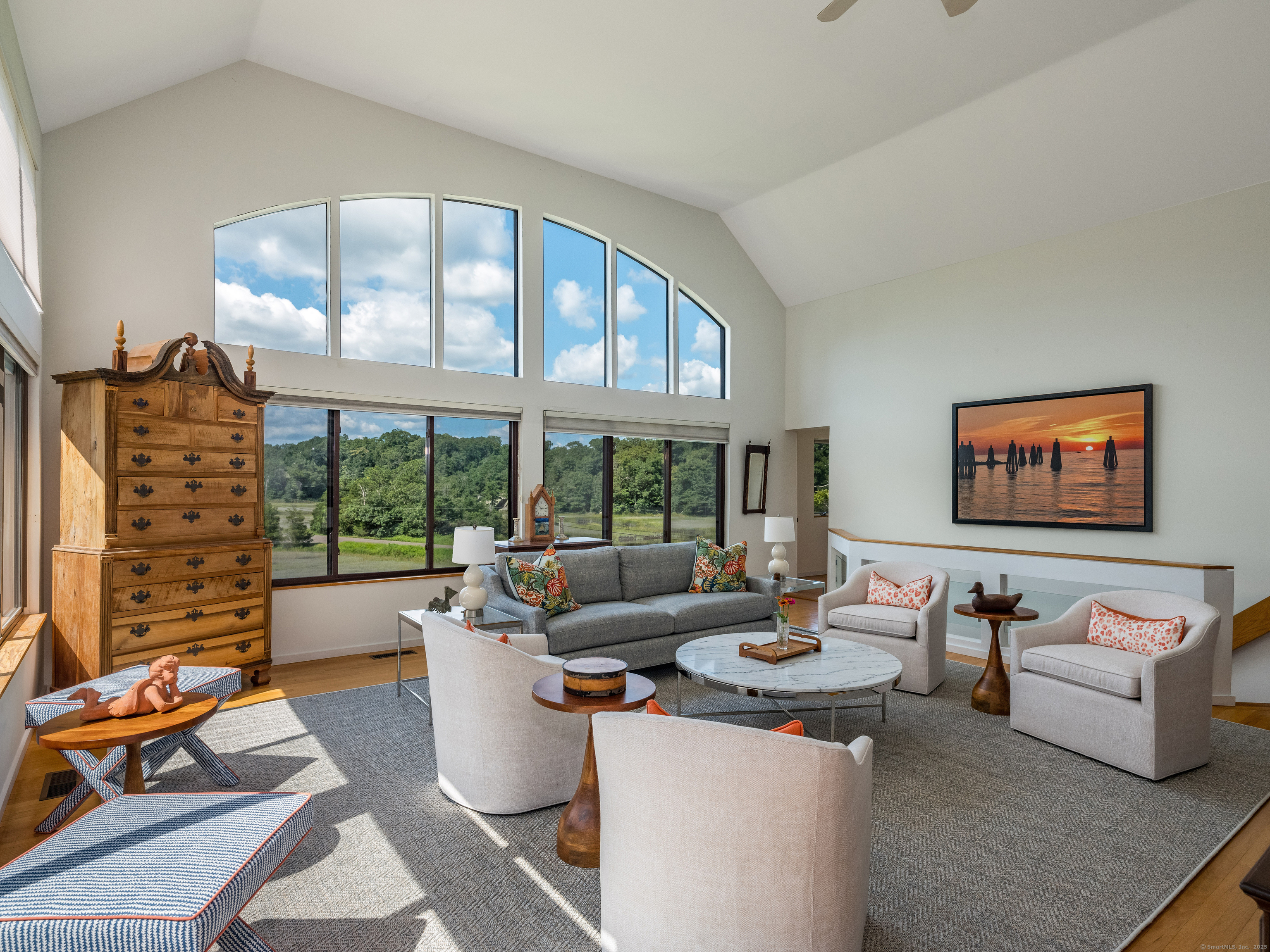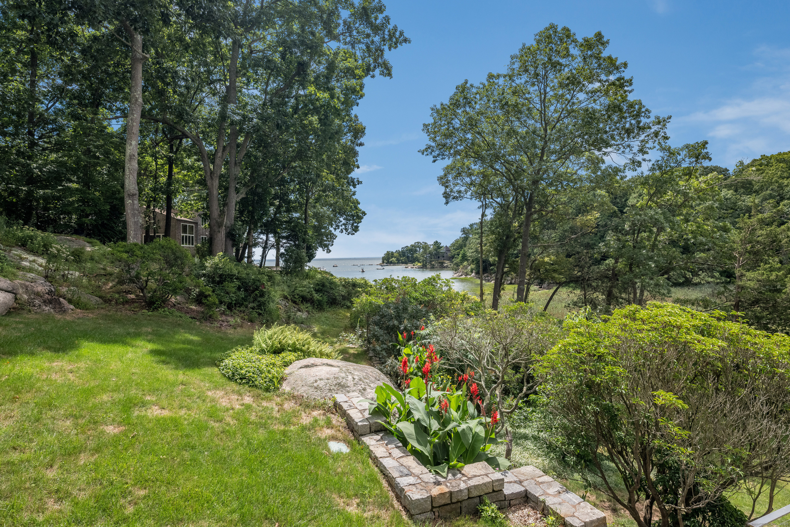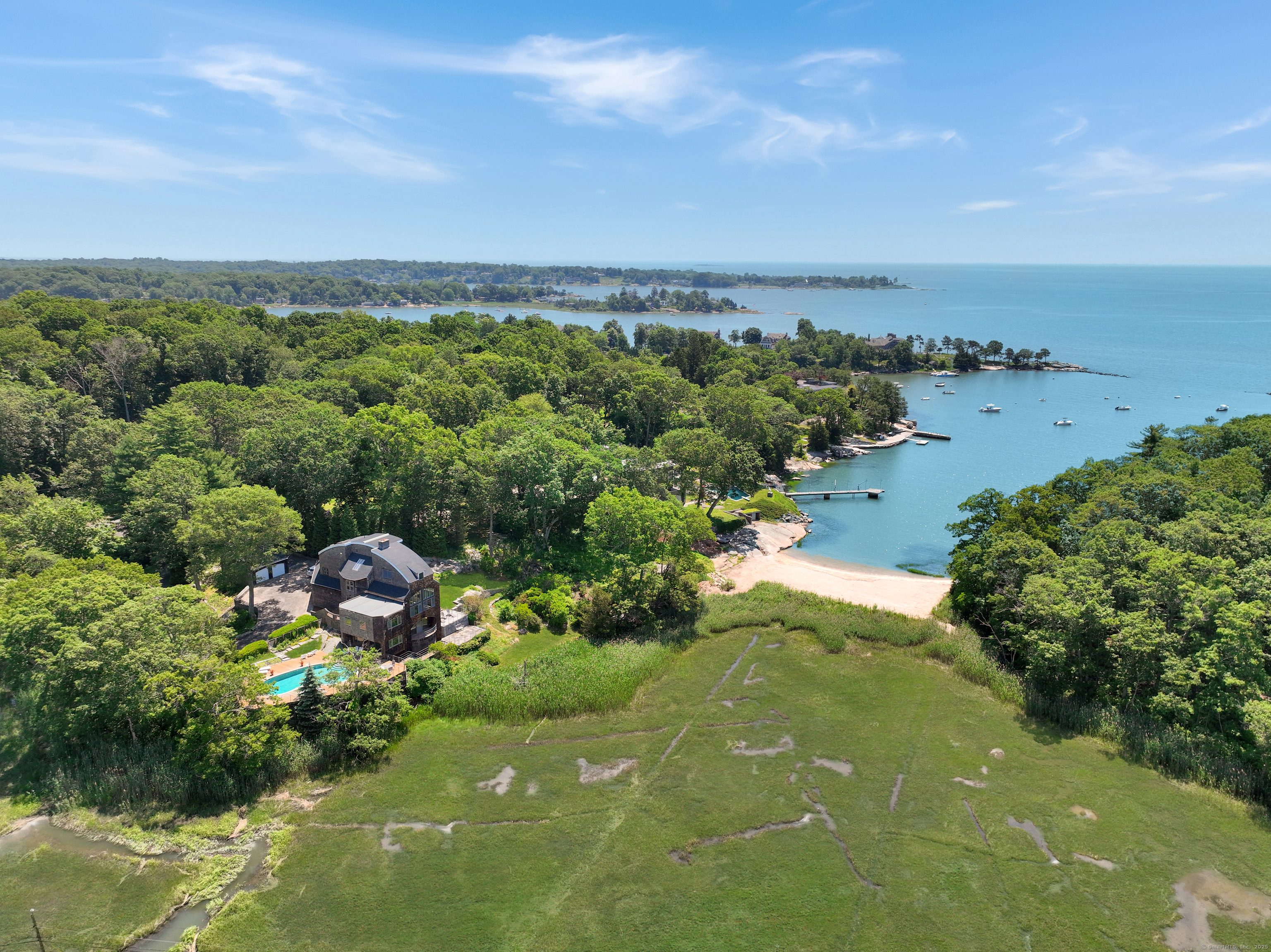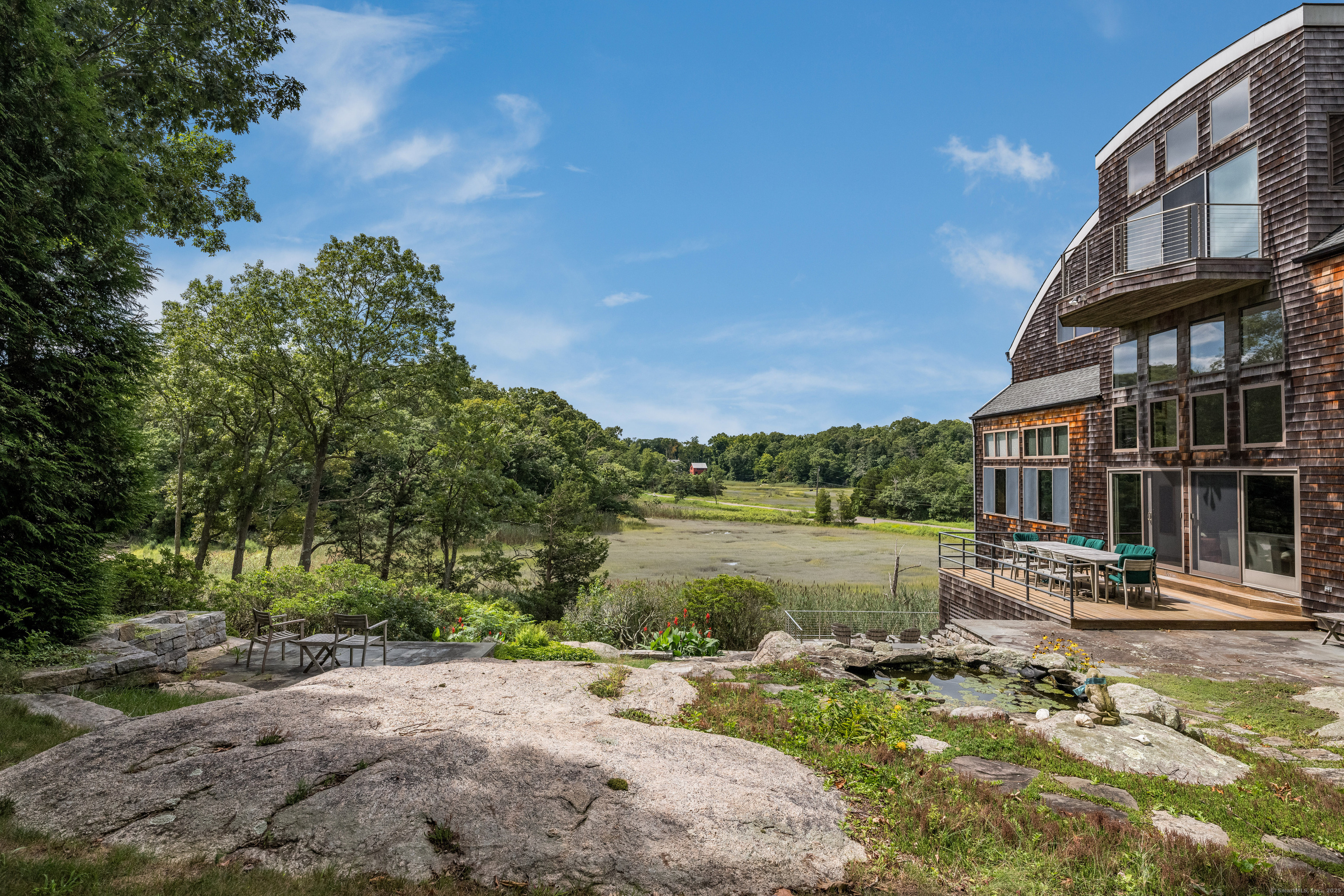 Guilford ~ Old Quarry Area ~ Waterview Contemporary ~ one of the most unique homes on the entire Eastern seaboard. Set on 3.39 Acres. Designed to capture spectacular southerly views over Little Harbor as well as Long Island Sound. With its walls of glass, high ceilings & numerous Transom windows this Unique Designed Home allows for natural views to flow easily through nearly every living area. The Main Level Features Dramatic Entertaining area including a spacious Renovated Chefs Kitchen with Wolf & Subzero Appliances, Granite counters & Center Island with Breakfast Bar. A Generous Great Room featuring wood burning FP, Curved 20ft ceiling, Family rm also with 20 ft Ceiling & Sliders to Large Deck, great for entertaining and evening dinners. Two Bedrooms overlooking Pool Area, plus full bath & powder rm complete this Floor. The upper level offers a Spectacular Primary Bedroom Suite w/deck for enjoying morning sunrises and evening sunsets, featuring a domed ceiling. Sitting Area/office w/FP & Sliders to Deck. Two additional bedrooms with Waterview's & bath. The Lower Level Offers a Guest bedroom w/ Wood Burning FP w/Sliders to Deck, Entertainment room leading to the pool area. Additional features include access to Little Harbor, Koi Pond, whole house generator, 2 car detached garage & circular driveway. Enjoy some of the best Boating, Kayaking & Hiking trails on the CT Shoreline. Convenient to Town, Yale and Train.